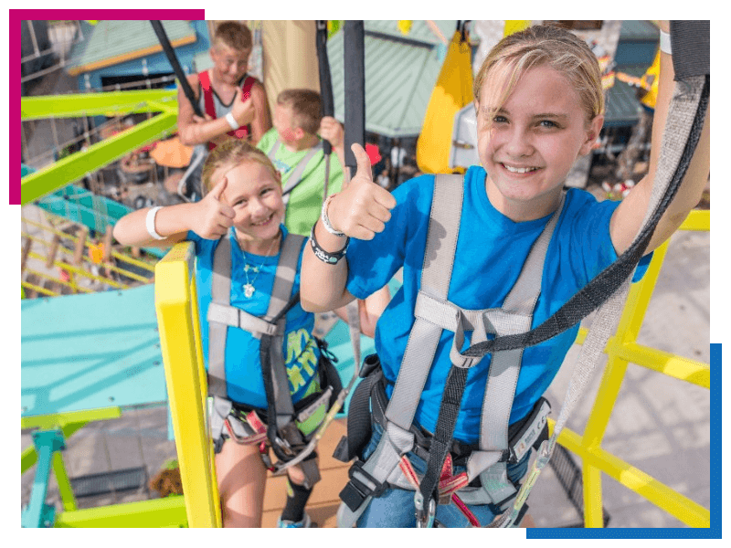 任何超过42英寸的人都可以去岛上绳索场,但如果你低于48英寸,你就需要一个更高的陪同。我们总是有一个持证员工在课程上,以备在你处理所有不同的元素的旅程中需要帮助。
